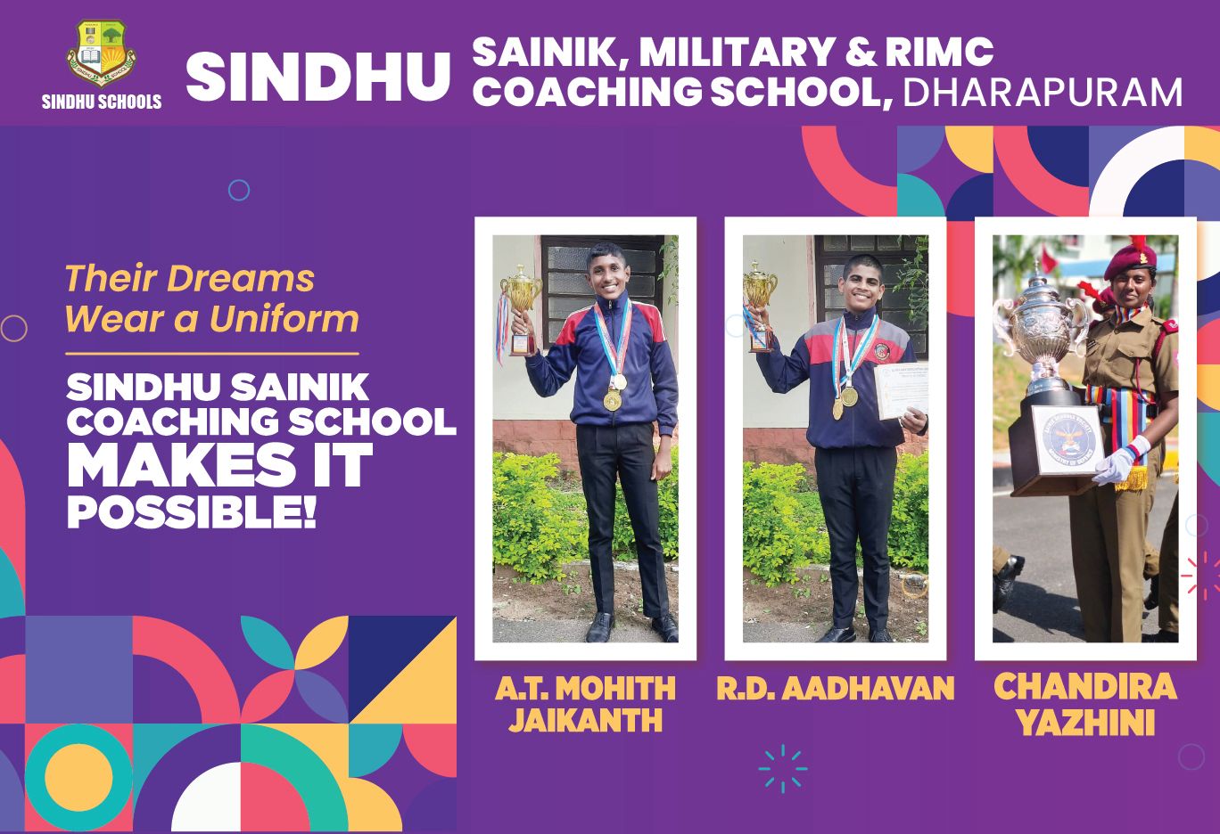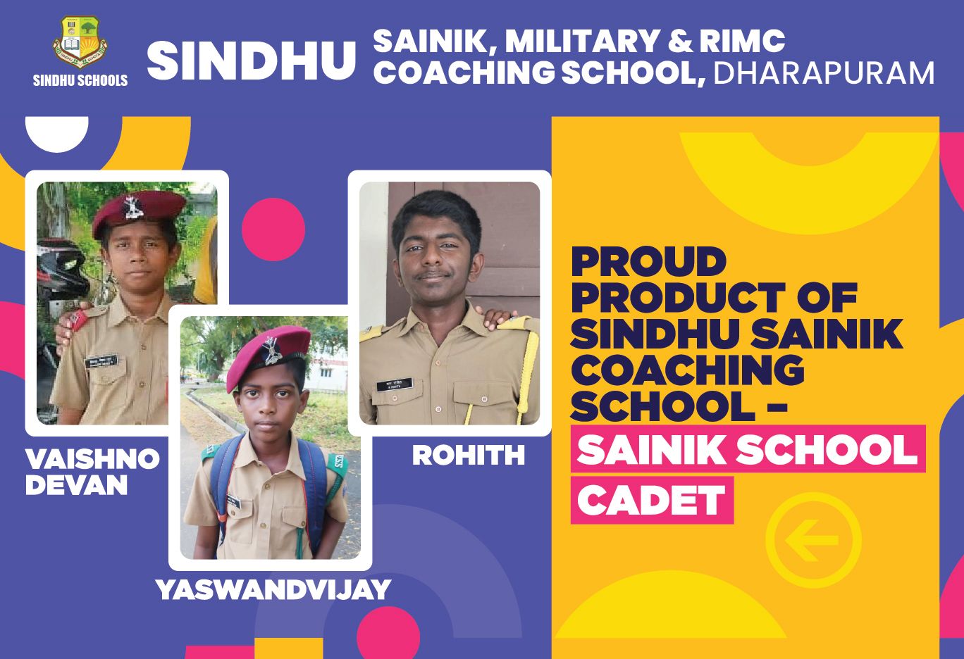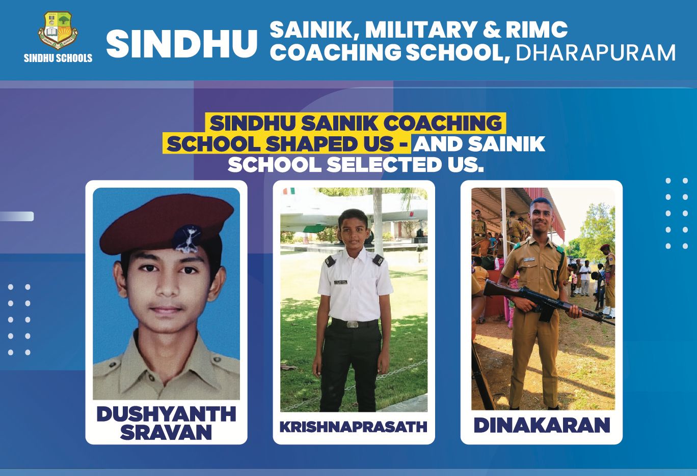 Sindhu Sainik, Military, & RIMC Coaching School is a division of the esteemed Sindhu Schools, a premier Co-Education Institution, run by the management of Amarar.V.K.N.C EDUCATIONAL TRUST and is Ranked as One of the best Sainik Coaching Schools in India. Our Educational Offerings are solely aimed at moulding the young aspirants of our country who dream of being a part of the National Defence Academy. ( NDA)