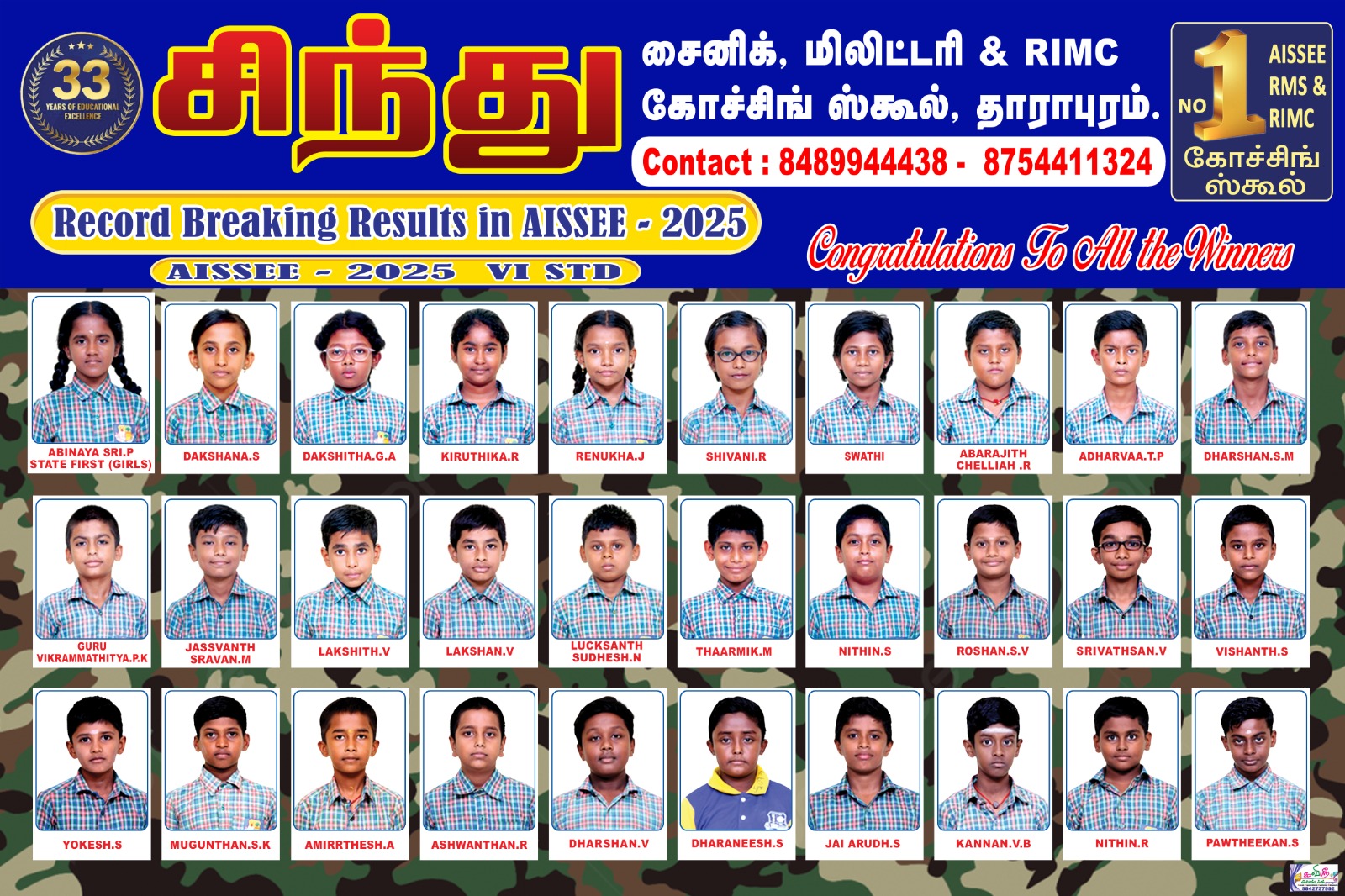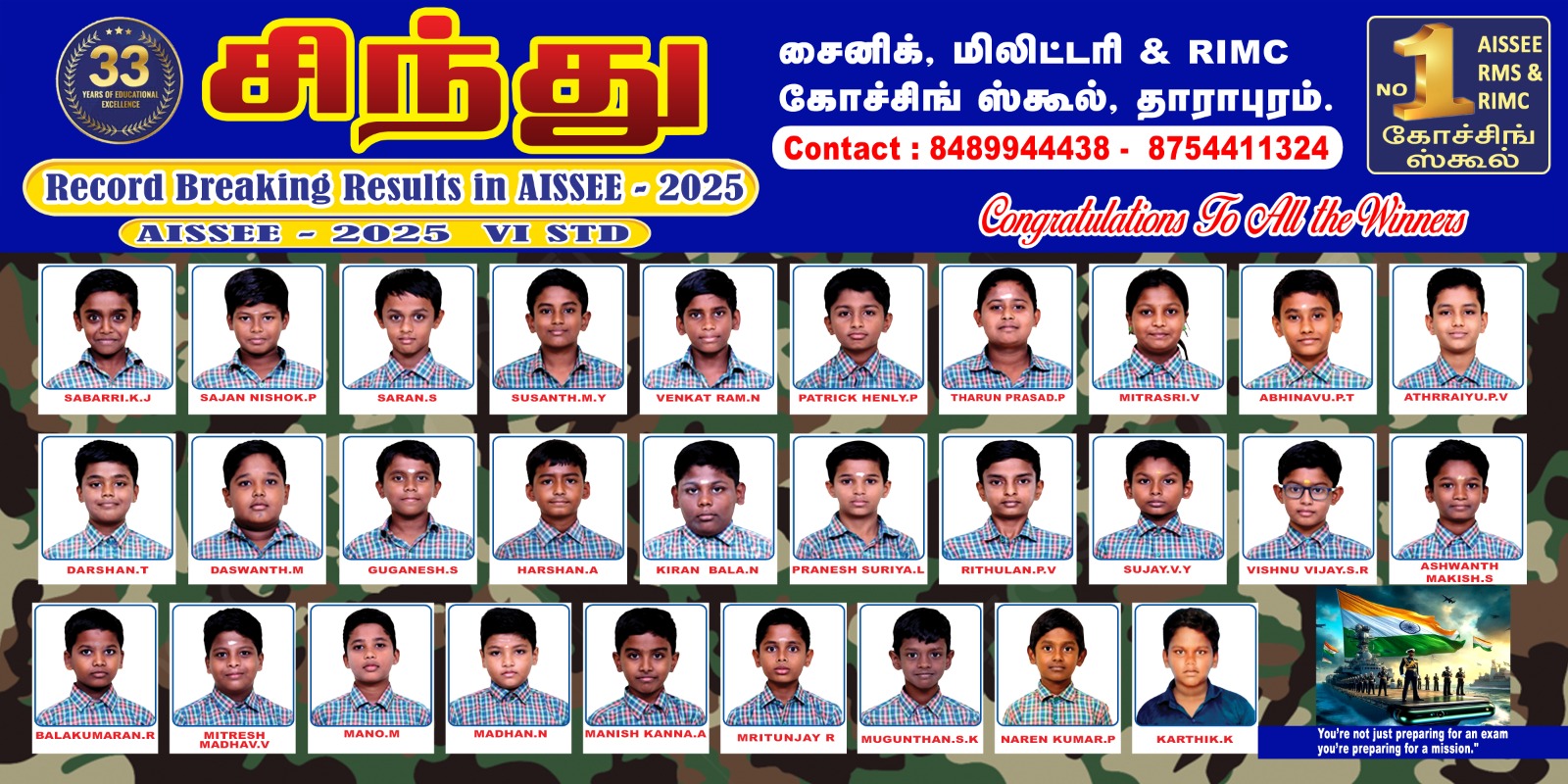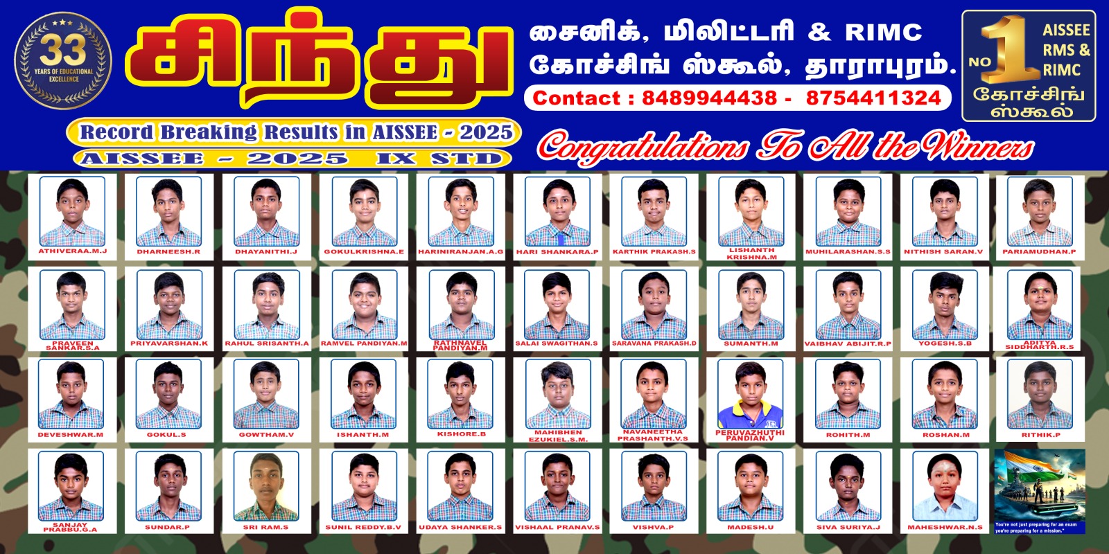 Sindhu Sainik, Military, & RIMC Coaching School is a division of the esteemed Sindhu Schools, a premier Co-Education Institution, run by the management of Amarar.V.K.N.C EDUCATIONAL TRUST and is Ranked as One of the best Sainik Coaching Schools in India. Our Educational Offerings are solely aimed at moulding the young aspirants of our country who dream of being a part of the National Defence Academy. ( NDA)